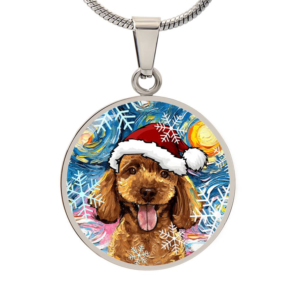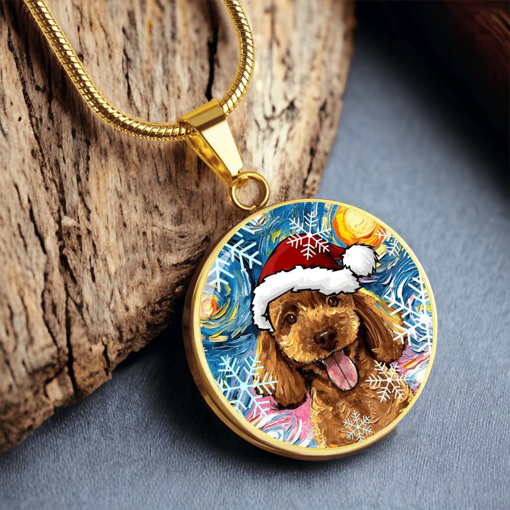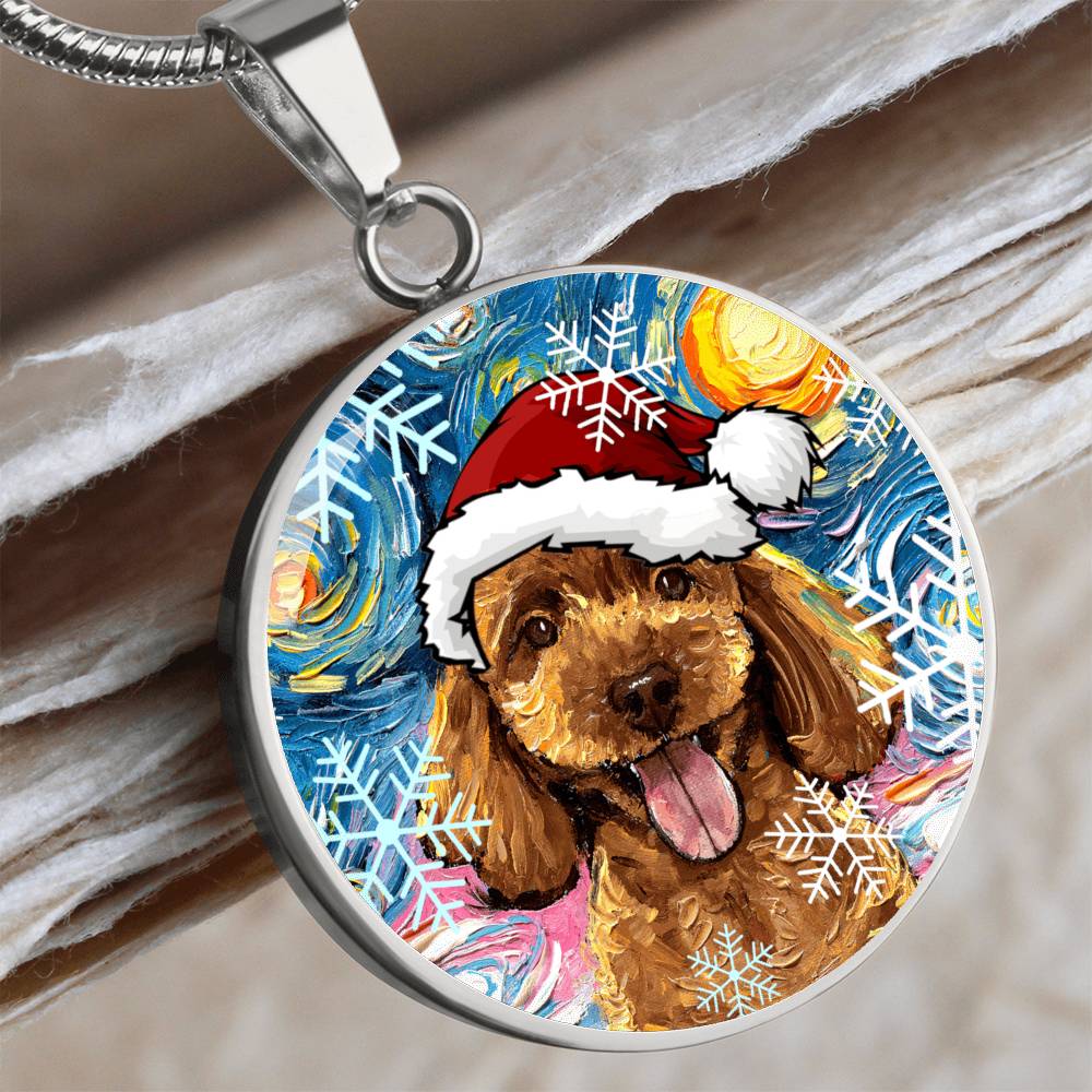Apricot Poodle In Santa Hat Starry Night Round Necklace