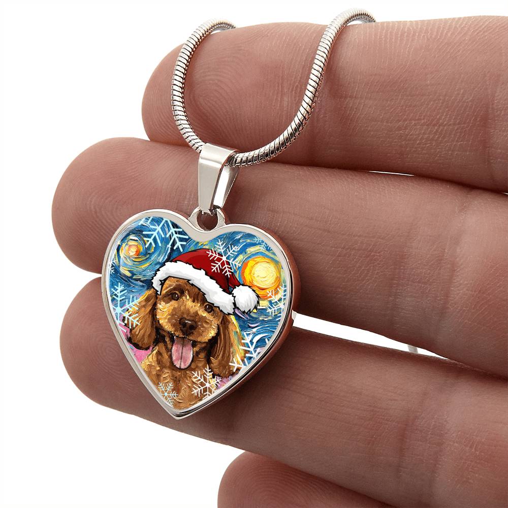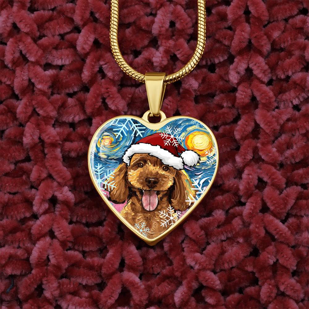 Apricot Poodle Puppy in Santa Hat Starry Night Heart Necklace