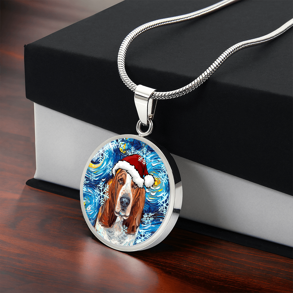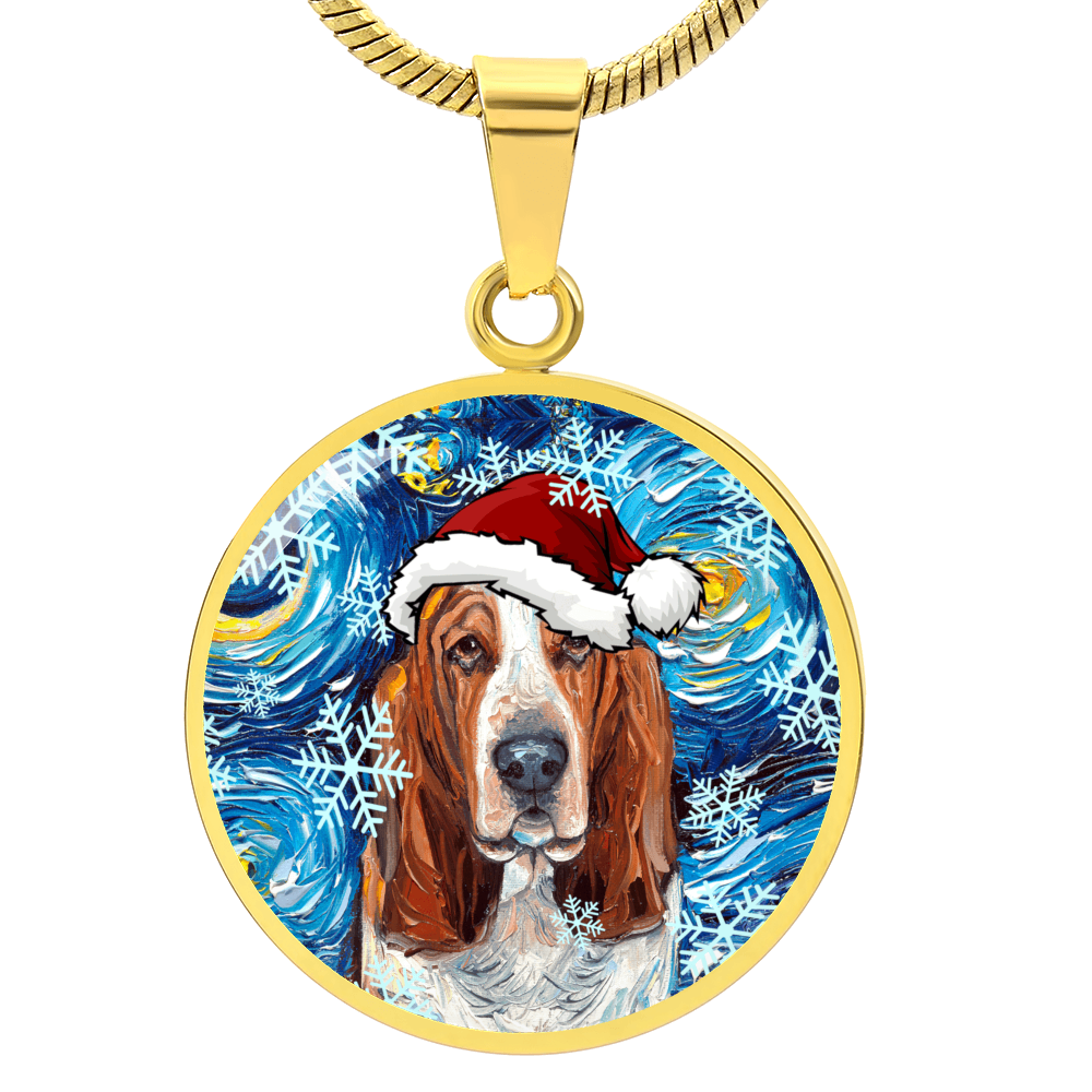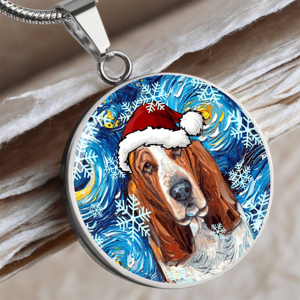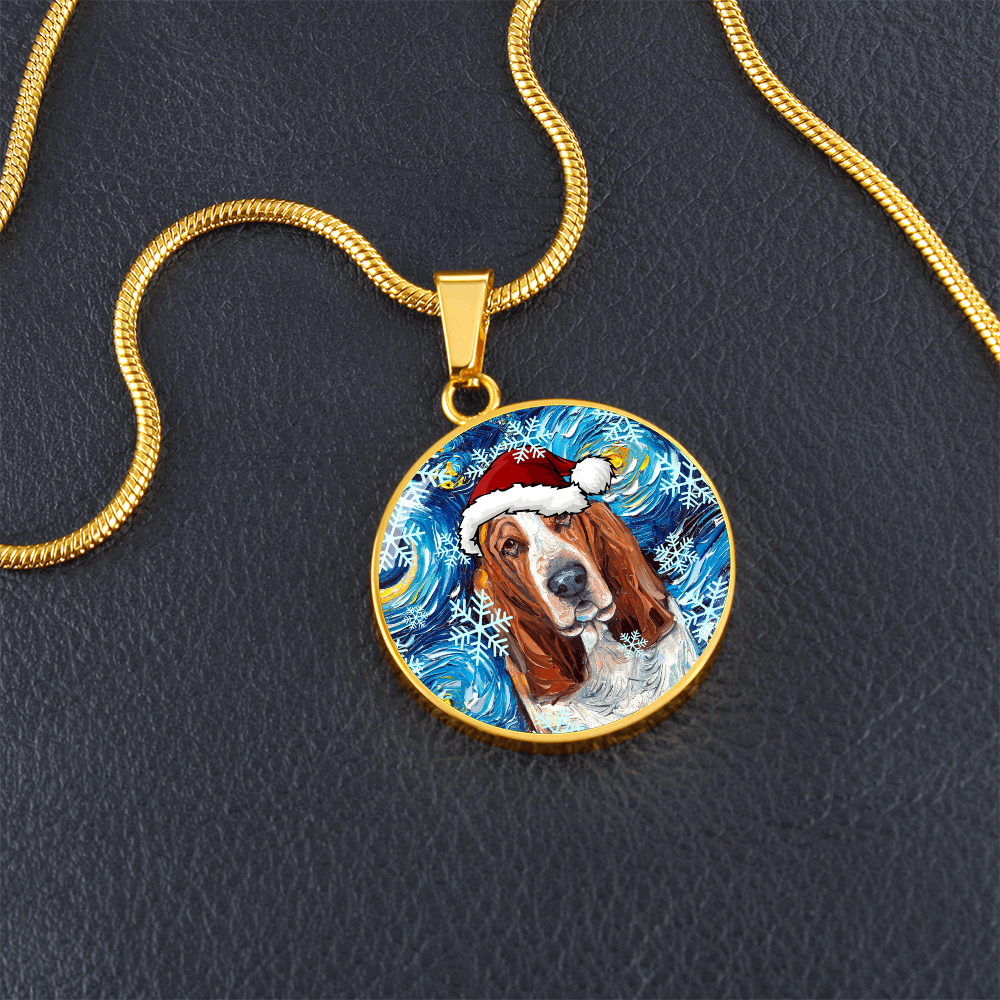 Basset Hound In Santa Hat Starry Night Round Necklace.