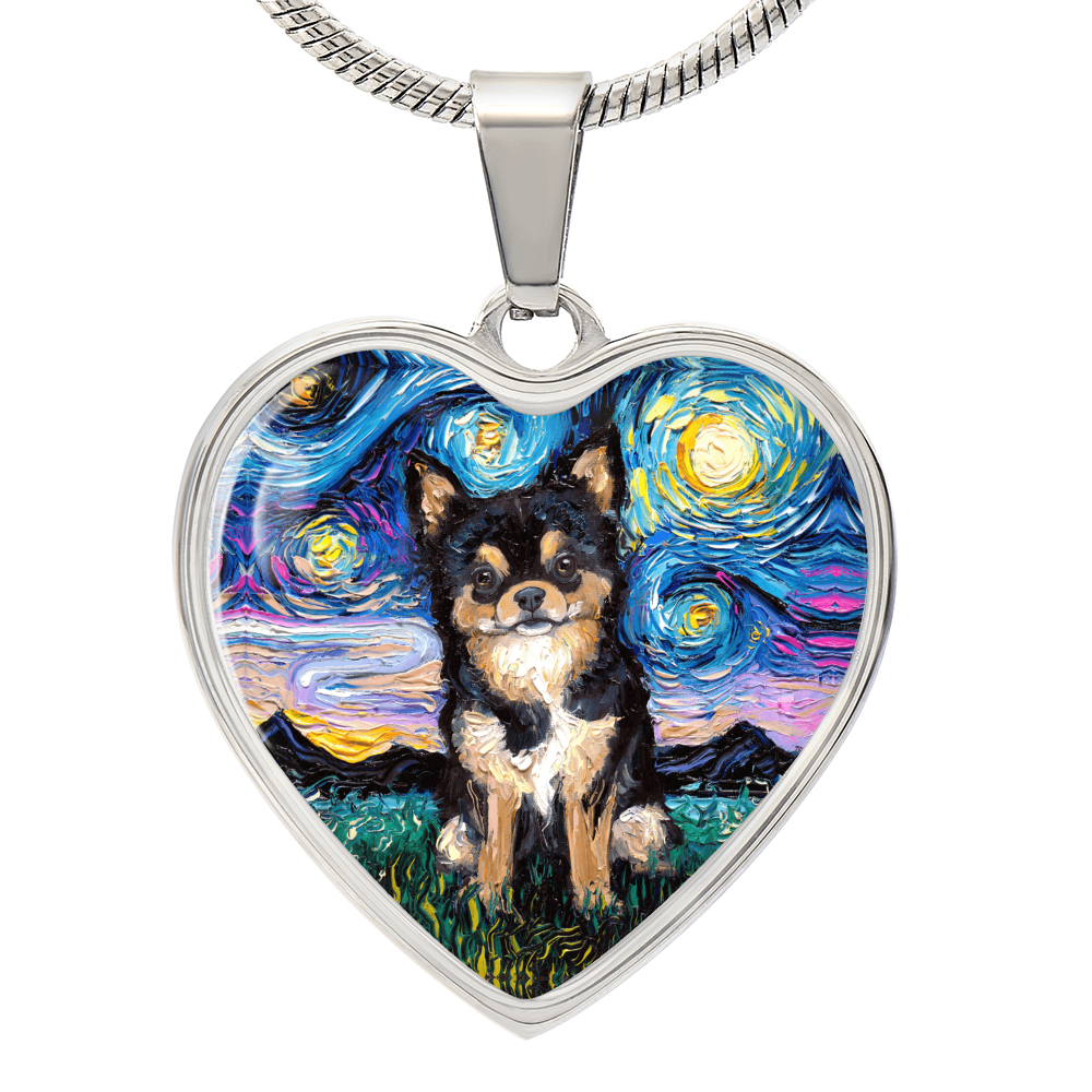 Long Hair Black and Tan Chihuahua Starry Night Heart Necklace