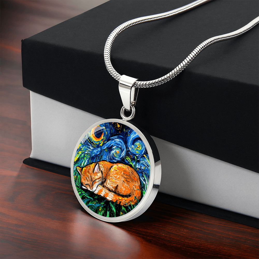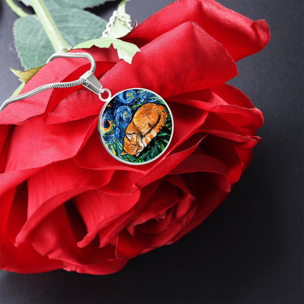 Sleeping Orange Tabby Cat Starry Night Round Necklace