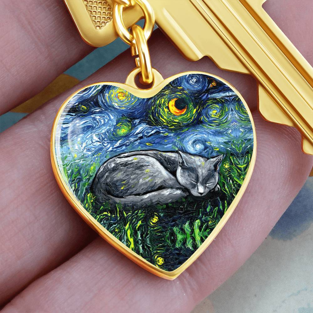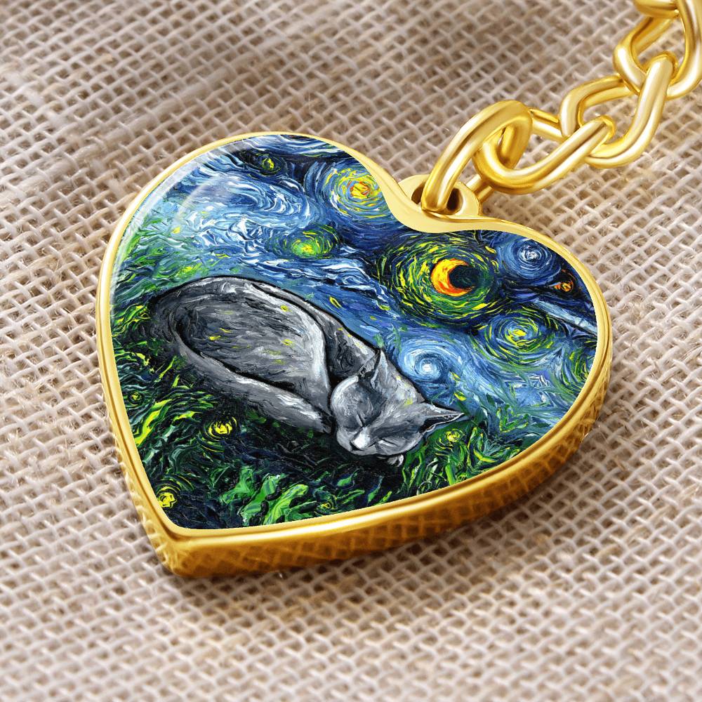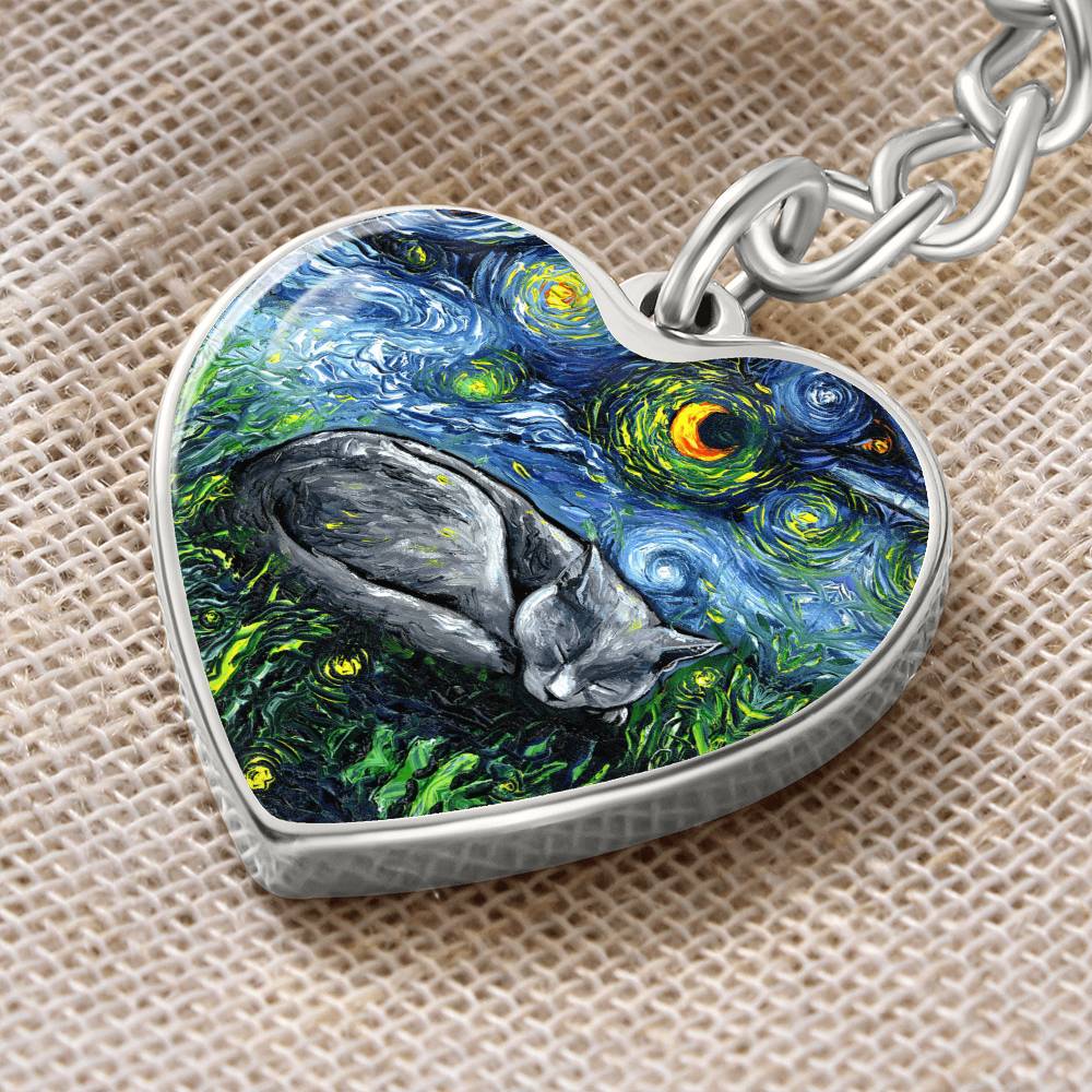 Russian Blue Cat Starry Night Heart Keychain