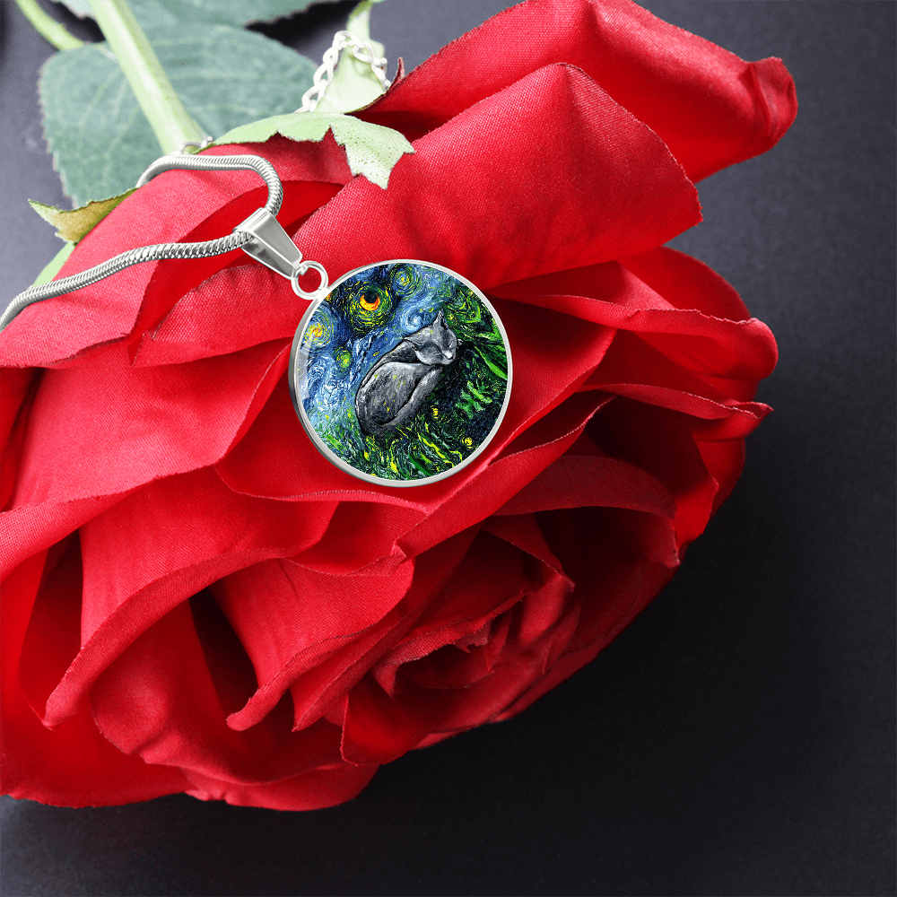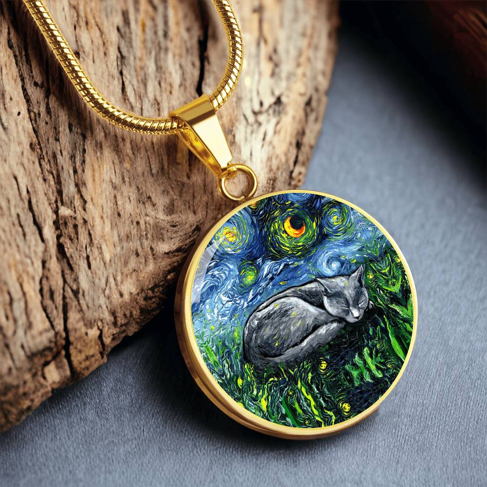 Sleeping Russian Blue Cat Starry Night Round Necklace