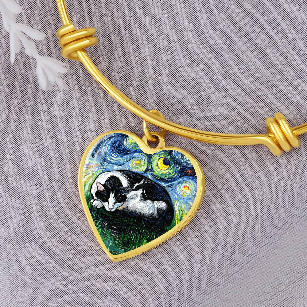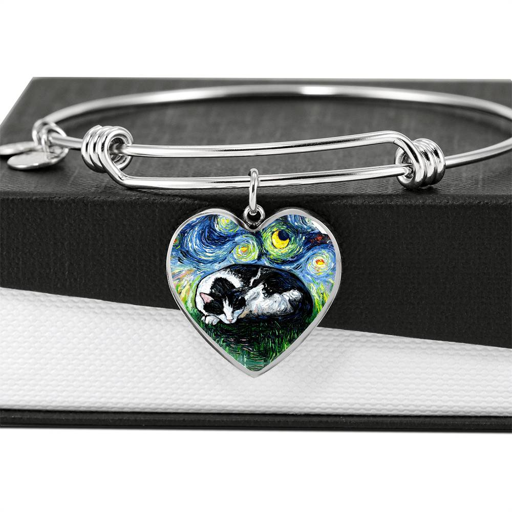 Sleeping Tuxedo Cat Starry Night Heart Bangle