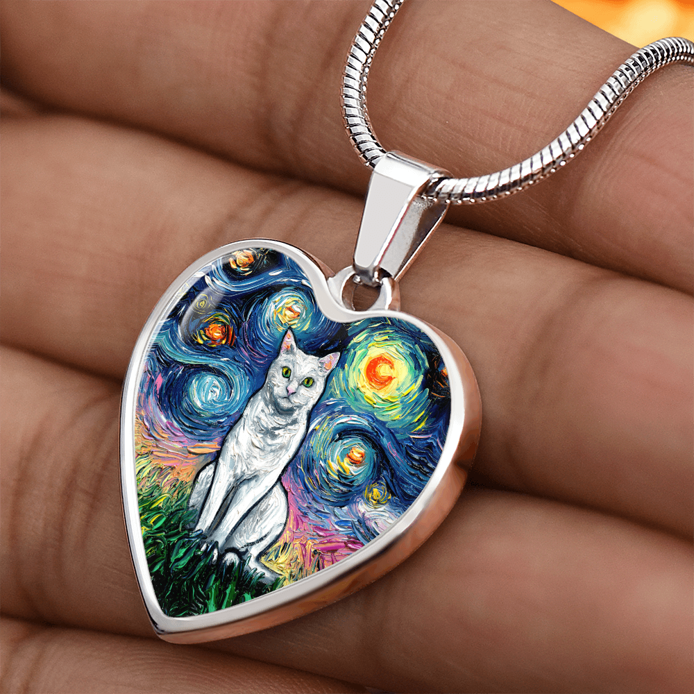 Seated White Cat Starry Night Heart Necklace
